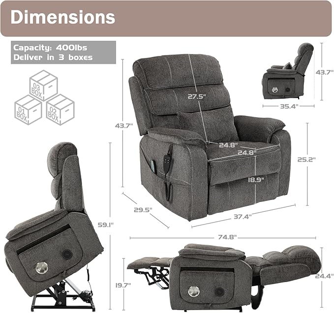 - 【Extended Footrest】This is a upgraded power lift recliner. We have extended the footrest so that you can stretch your body at full length and still have your feet well supported without cutting off circulation. Overall size: 37.4"D x 35.54"W x 43.7"H. Heavy duty steel mechanism is designed to support up to 400lbs. Suitable for big and tall people.