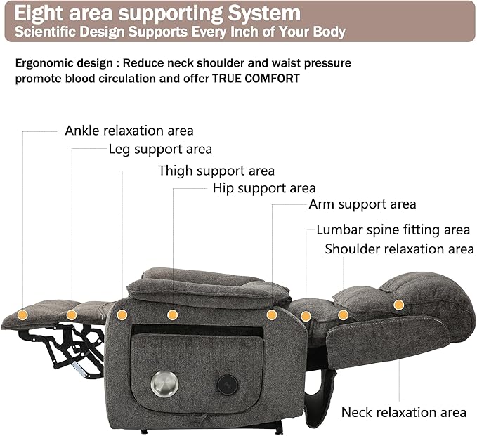 - 【Vibration Massage and Lumbar Heating】This electric recliner is specially designed with 8 vibrating points massage (back/lumbar/thighs/legs), lumbar heating function is good for waist pressure relief and blood circulation, taking away the stress and tiredness. The timer function in 15/30/60 minutes which is convenient for you to set massaging time. Own this lay flat recliner chair, you can have a full body massage at home.
