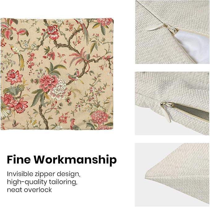 - 【Spring Pillow Covers】 Our Chinoiserie floral throw pillow covers 18x18 inch are made of excellent breathable polyester cotton fabric. The pink red floral decorative pillow covers is durable, soft and skin-friendly. The plant outdoor pillow covers adopt exquisite edging technology and four sides of our floral pillow covers are sewn firmly, which is not easy to open the line.