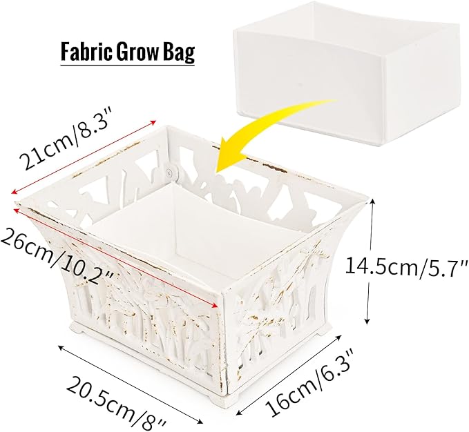 Sungmor Heavy Duty Cast Iron Planter Basket w/Non-Woven Growing Bag, Unique Shape & Beautiful Pattern Design, Hollow Orchid Flower Pot Garden Tools Holder, Rust White French Country Decor Container