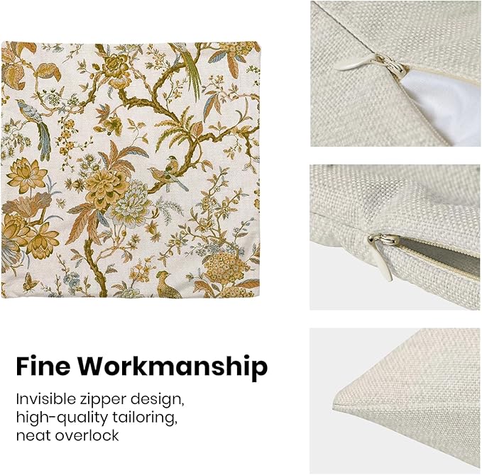 - 【Summer Pillow Covers】 Our Chinoiserie floral throw pillow covers 20x20 inch are made of excellent breathable polyester cotton fabric. The mustard yellow floral decorative pillow covers is durable, soft and skin-friendly. The plant outdoor pillow covers adopt exquisite edging technology and four sides of our spring pillow covers are sewn firmly, which is not easy to open the line.