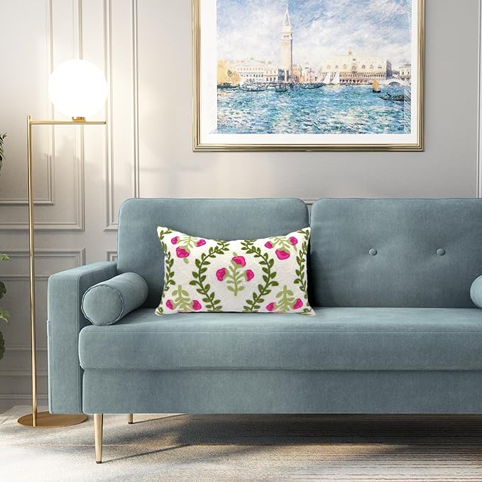 Alysheer Flower Embroidered Summer Decorative Lumbar Throw Pillow Cover 12"x 20", Farmhouse Cottage Hot Pink Floral Green Leaves Patterned Cotton Canvas Cushion Case for Sofa Couch Bed Living Room