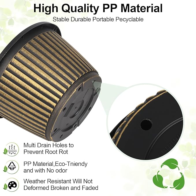 - 【Perfect Size & sturdy Material】Top diameter: 10 inch, bottom diameter: 6.57 inch, height: 6.4 inch, capacity: 1.34 gallon. Plastic plant pots are made of recyclable polypropylene resin which is lightweight but sturdy, not easy crack. These indoor outdoor planters are UV and weather resistant. 10 inch flower pot is perfect for planting medium to large sized plants.