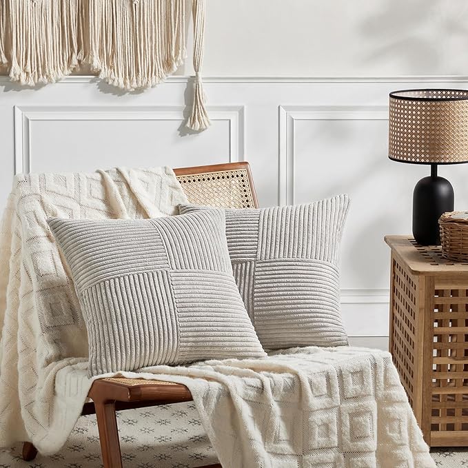 Fancy Homi 2 Packs Neutral Grey Decorative Throw Pillow Covers 18x18 Inch for Living Room Couch Sofa, Rustic Farmhouse Boho Home Decor, Soft Corss Corduroy Patchwork Textured Square Cushion Case 45cm