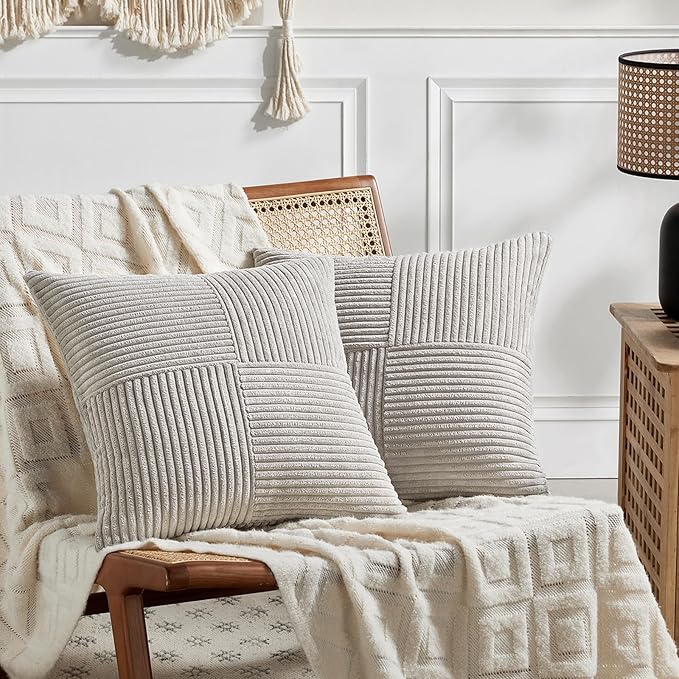Fancy Homi 2 Packs Neutral Grey Decorative Throw Pillow Covers 22x22 Inch for Living Room Couch Bed Sofa, Rustic Farmhouse Boho Home Decor, Soft Corss Corduroy Patchwork Accent Cushion Case 55x55 cm