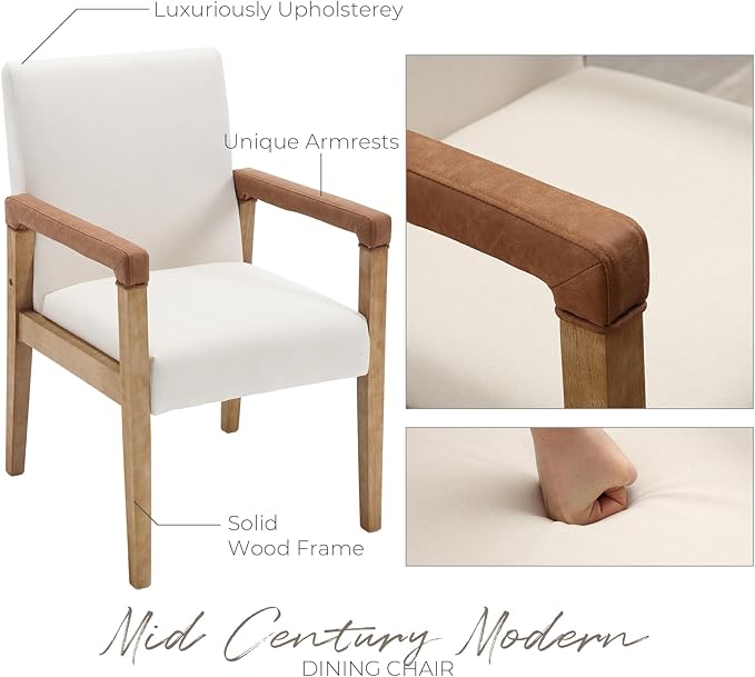 Mid Century Modern Dining Chairs Set of 4 Fabric Upholstered Living Room Side Chair, Kitchen Arm Chair with Solid Wood Legs for Home Restaurant, Linen White
