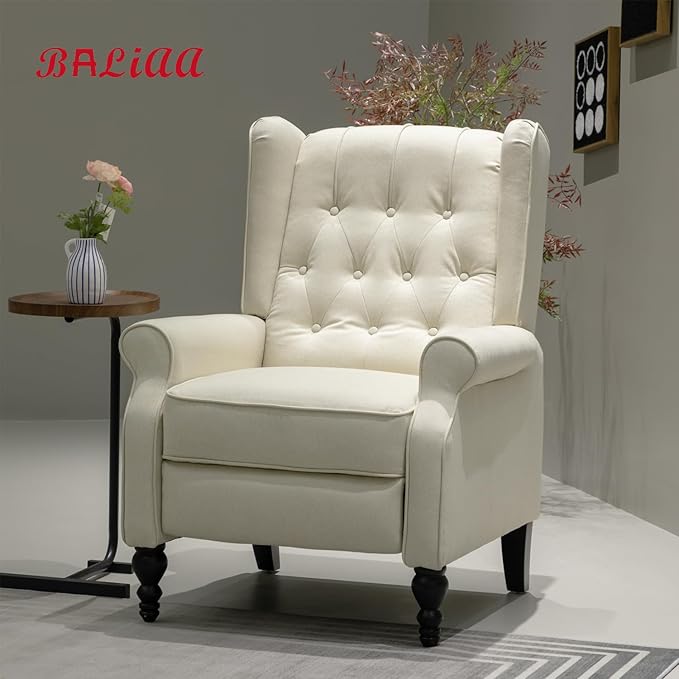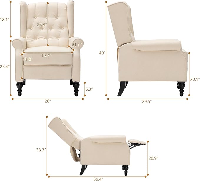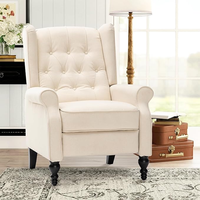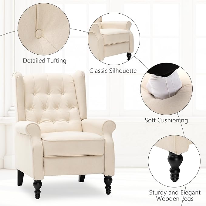 Mid Century Wingback Recliner Chair for Adults, Modern Linen Fabric Push Back Recliner Chairs with Button Tufted Upholstered Back & Footrest, Manual Recliner Chais for Living Room, Nursery, Beige