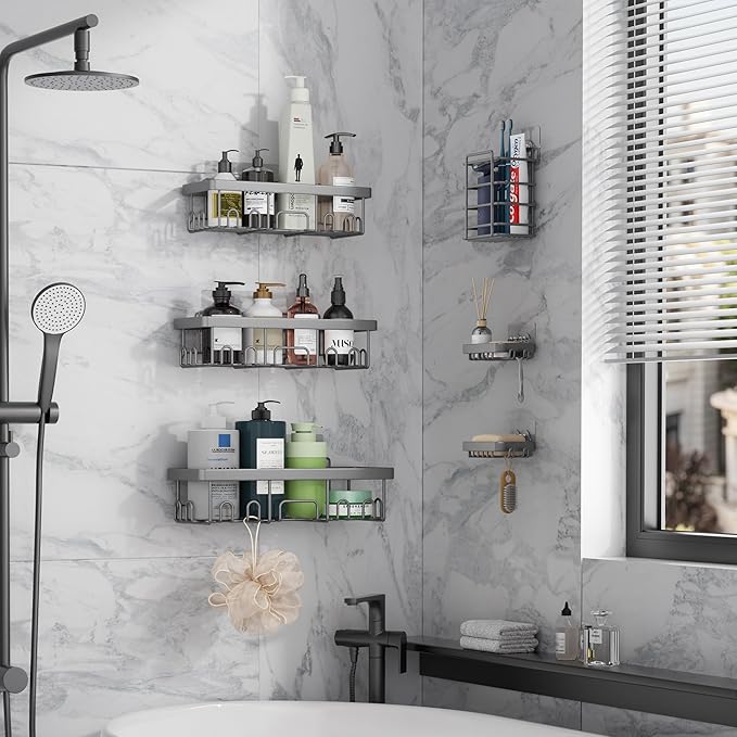 - Comprehensive Organization: This 6-piece set includes large, medium, and small caddies, along with soap and toothbrush holders, providing versatile storage for all your shower essentials