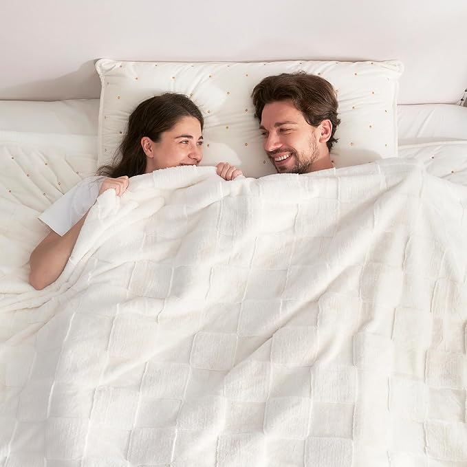Cozy Bliss Checkered White Large Faux Rabbit Fur Queen Size Blanket, Soft Fuzzy Fluffy Minky Cream Furry Blankets for Couch, Bed (90 * 90 Inches Ivory)