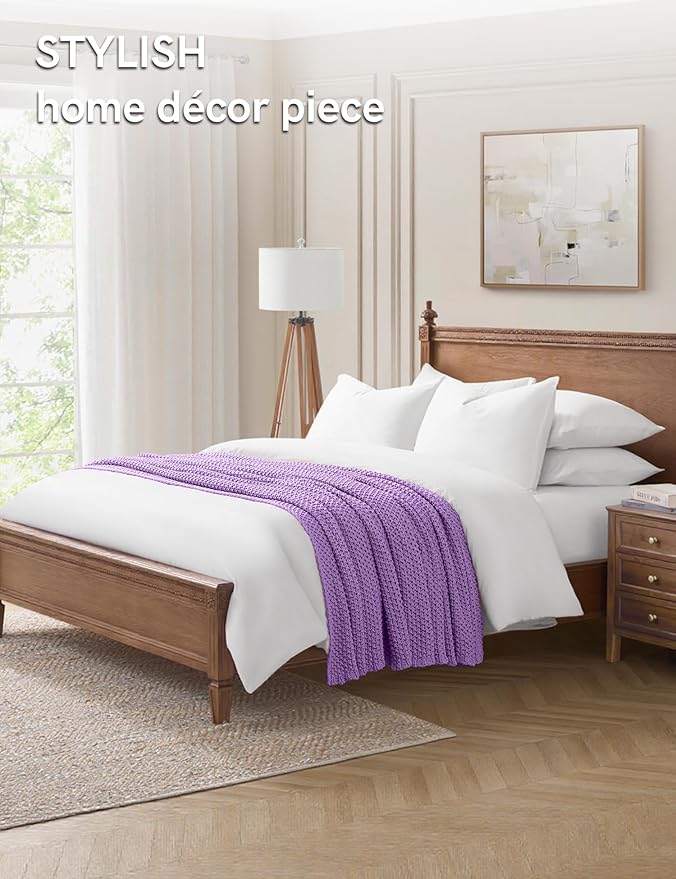 YnM Chunky Cotton Knit Throw Blanket, Cable Knit Throws for Bed Couch Sofa, Comfy & Relaxing, Decorative Piece for Farmhouse Modern Boho Rustic Scandinavian Chic Vibe, Lilac Purple 50x60 Inches
