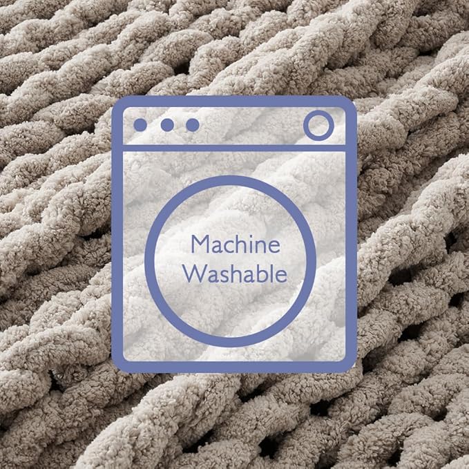 Bigacogo Chunky Knit Throw Blanket for Couch, 40x60 inches, 100% Hand Knitted with Thick Jumbo Chenille Yarn, Cozy Soft Large Rope Knot Cable Crochet Blankets for Sofa Bed Living Room, Taupe