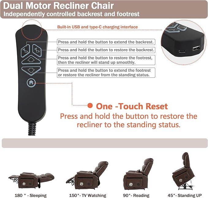 - 【Convenient Home Button, USB and Type-C Charger】We upgraded the remote control to make our chair more convenient to operate. The new remote control is equipped with USB port and Type-C charging interface and a Home button. Simply press and hold the Home button to reset the chair to a standing position within 15 seconds. You can release the button at any time to keep the chair in the position you need.