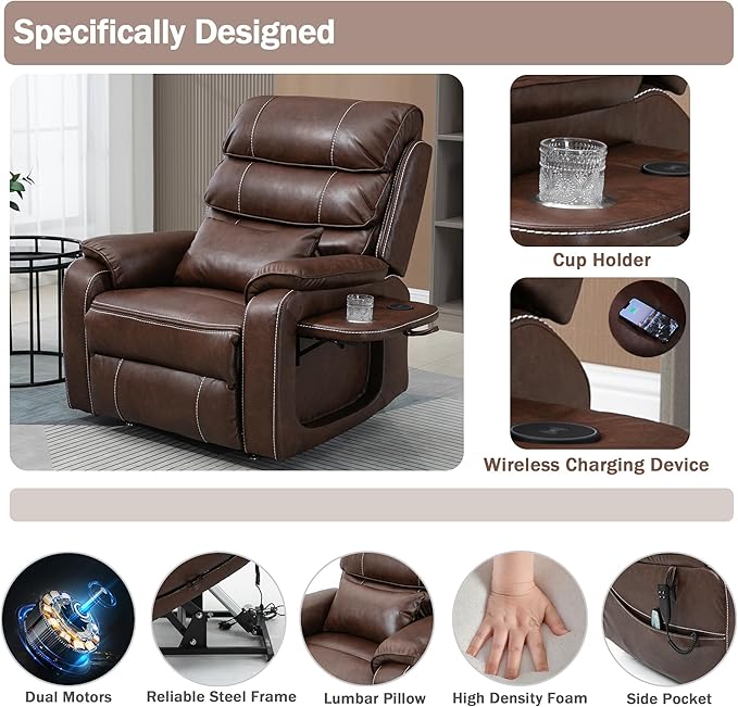 - 【Cup Holder & Wireless Charging Device】What a great chair!This recliner is designed with side pocket and a foldable tray table with cup holder and wireless charging device for cell phone. Just imagine that put your drink on the cup holder, without having to find sockets or tangle with cables, the efficient wireless charging feature makes charging easier and stylish. You will have a good time reading, sleeping, watching TV, and so on.