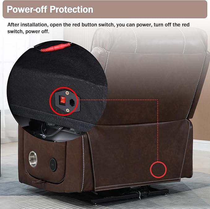 - 【Power Outage Protection Device】 When you don't need to use the chair, you don't need to unplug the power plug, just turn off the power switch on the base at the back of the chair to achieve the power-off effect.