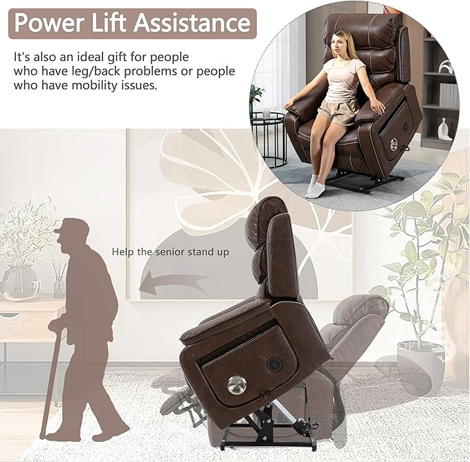 Power Lift Recliner Chair for Adults Elderly Lay Flat Leather Recliners with Massage Heating, Extended Footrest, Wireless Charging Device, USB Ports, Cup Holder, Lumbar Pillow, Up to 400LBS