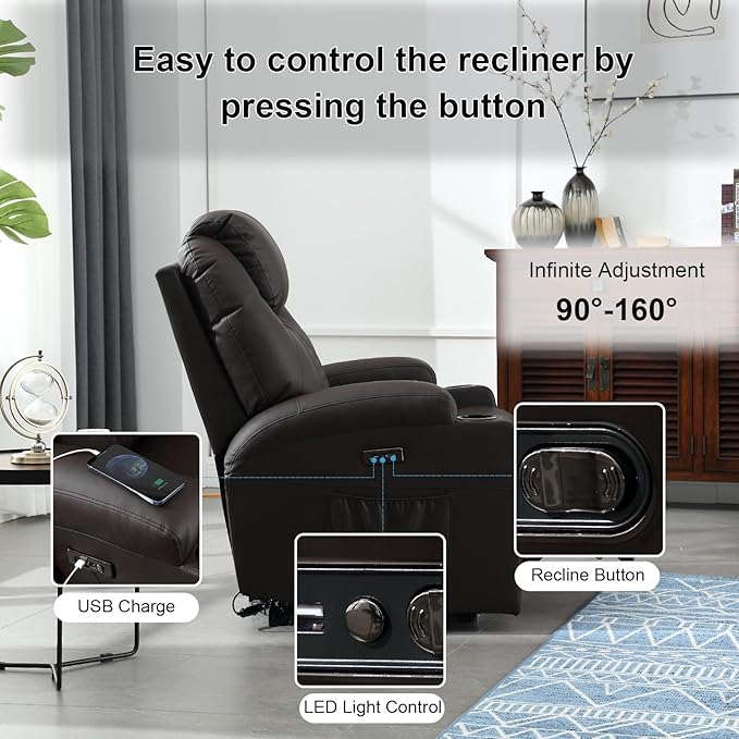 Power Recliner Chair with Heat and Massage, PU Leather Home Theater Seating with LED Lights/Cup Holders/Side Pocket/USB Port, Reclining Sofa Chair for Living Room(3, Brown)
