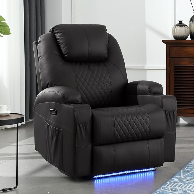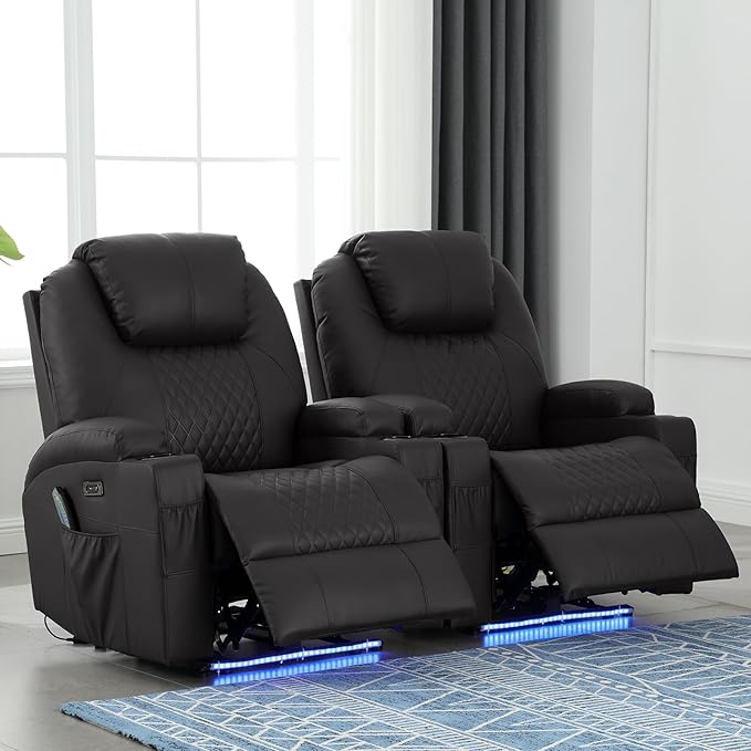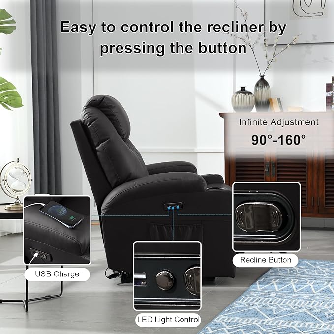 Power Recliner Chair with Heat and Massage, PU Leather Home Theater Seating with LED Lights/Cup Holders/Side Pocket/USB Port, Reclining Sofa Chair for Living Room (1, Black)