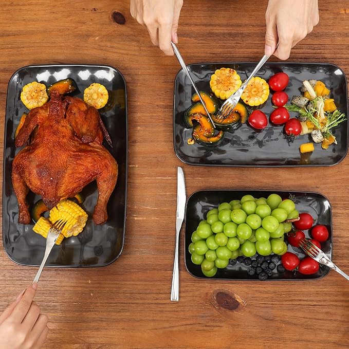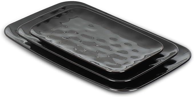 - NO-SPILLING & STACKABLE: These rectangular serving platters nest beautifully for storage and areeasily stackable. This serving platter is designed with Rectangle shape and a narrow rim. The rimhelps prevent from messes or spills by keeping foods and sauces contained on the platter!