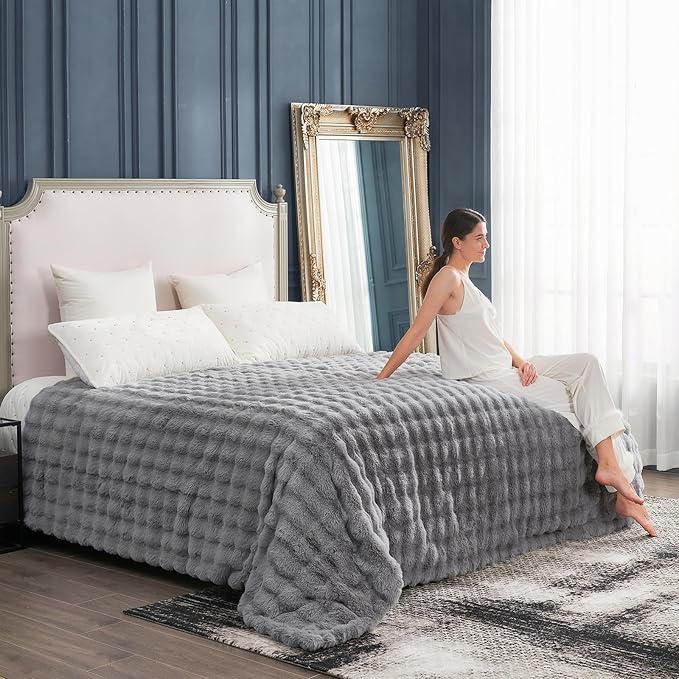 - Experience ultimate comfort and warmth with our Bubble Shape Faux Fur Throw Blanket. Made with 450GSM fluffy faux rabbit fur face side and silky micromink fleece inside, this throw blanket is ultra soft and cozy on both sides. The selected fabric weight provides the perfect balance of warmth without causing overheating, making it ideal for cold moment.