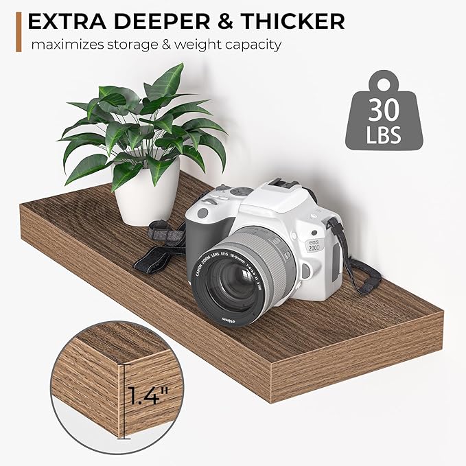 - Extra Deeper & Thicker - Each board measures 16"W x 6.7"D x 1.4"H. Extra deeper and thicker design in order to bring maximizes storage space and weight capacity, even hold up to 30 lb each. This floating shelf taking up zero square feet, reduces clutter and highlights dΓ©cor in compact spaces. even hold up to 50 lb each. This floating shelf taking up zero square feet, reduces clutter and highlights dΓ©cor in compact spaces.