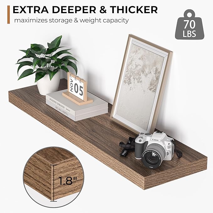 - Extra Deeper & Thicker - This wall shelf measures 36"W x 10.23"D x 1.8"H. Extra deeper and thicker design in order to bring maximizes storage space and weight capacity, even hold up to 70 lb. This floating shelf taking up zero square feet, reduces clutter and highlights dΓ©cor in compact spaces.