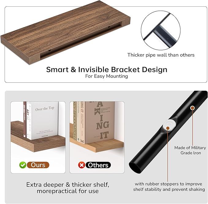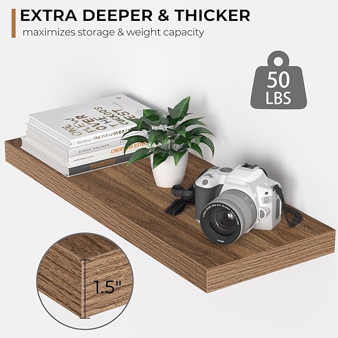 - Extra Deeper & Thicker - Each board measures 24"W x 9"D x 1.6"H. Extra deeper and thicker design in order to bring maximizes storage space and weight capacity, even hold up to 50 lb each. This floating shelf taking up zero square feet, reduces clutter and highlights dΓ©cor in compact spaces.