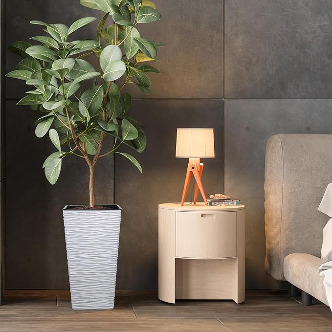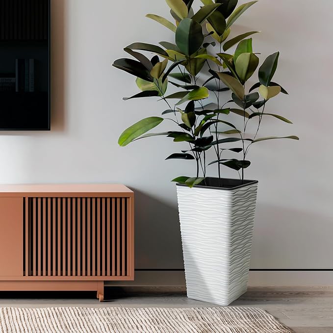 Worth Garden 2-Pack 22" H. White Square Tapered Planter with Inside Pots - Plastic Plant Pots for Indoor Outdoor - Modern Wavy Finish Decorative Flower Pots for Front Porch Containers Patio Deck