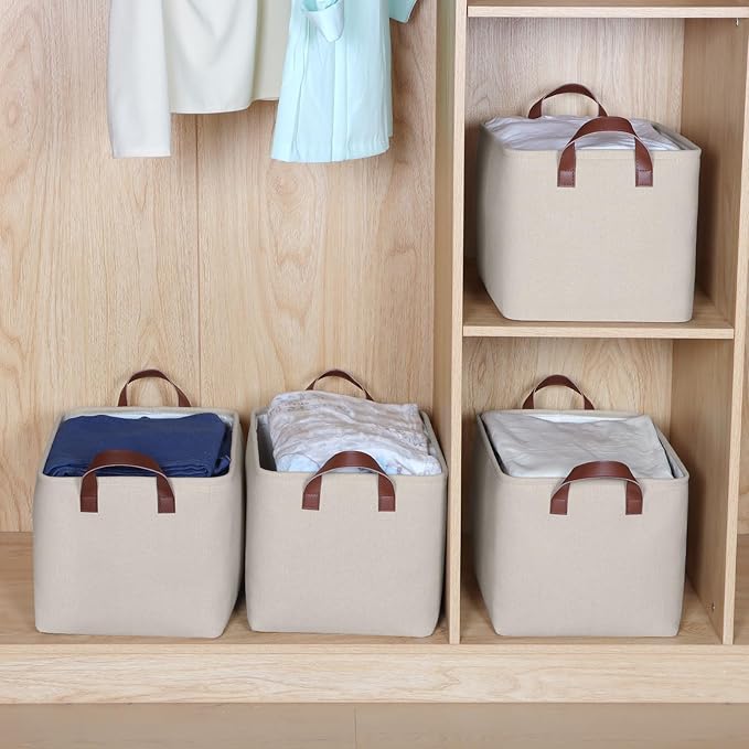 KEEGH Storage Baskets for Organizing, Fabric Storage Bins for Shelves with Leather Handle, Shelf Baskets for Closet Organization Closet Organizer Bins for Clothes, 15" L x 11" W x 10" H, Beige, 4 Pack