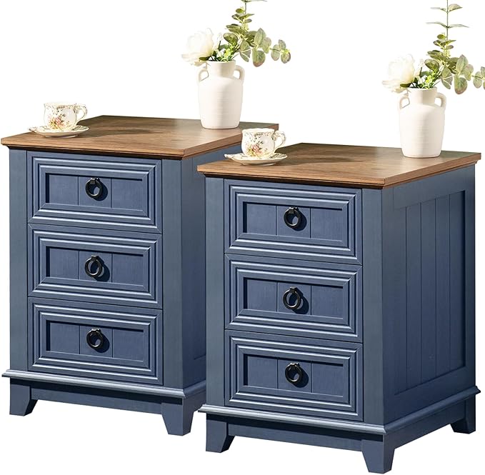 Night Stand Set of 2, Farmhouse 18" End Table with 3 Drawer Metal Handle, Dresser for Bedroom, Sofa Bed Side Table Chest of Drawers,Wood Nightstand Cabinet for Organizer, Living Room-Blue