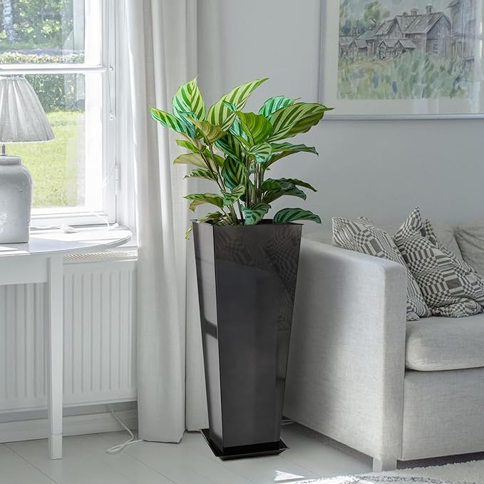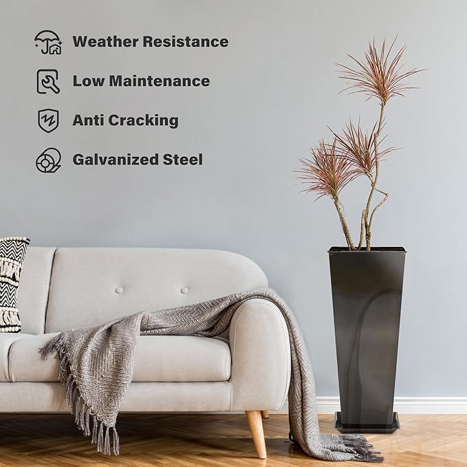 KOL 28''H. Tall Galvanized Steel Glazed Planter with Insert, Set of 2, Planter Pots for Indoor & Outdoor Use, Decorative Flower Plant Pots with Drainage Hole for Front Porch, Patio, Deck - Black
