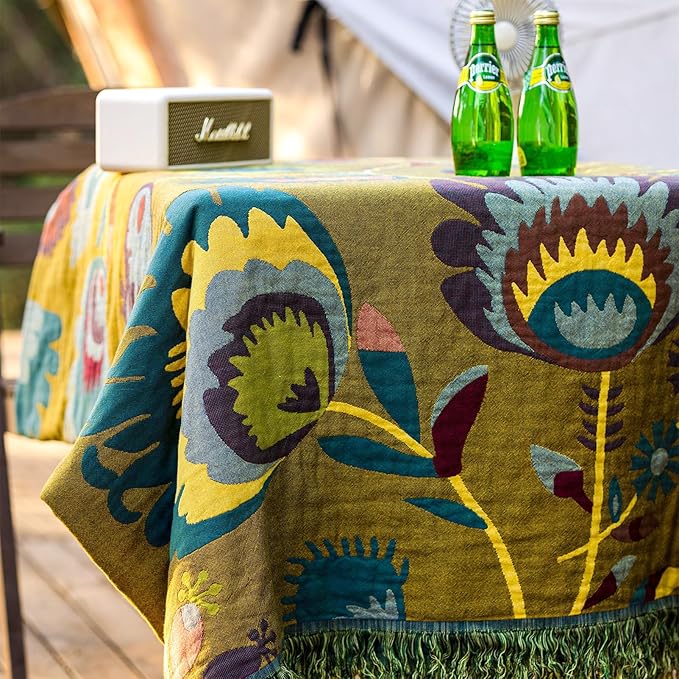 Snycler Boho Throw Blanket for Bed, 100% Organic Cotton Muslin Soft Throw-Yellow Boho Floral Farmhouse Rustic Spring Summer Fall Decor Blanket for Couch Sofa Quilt and Gift, 80" x 90"