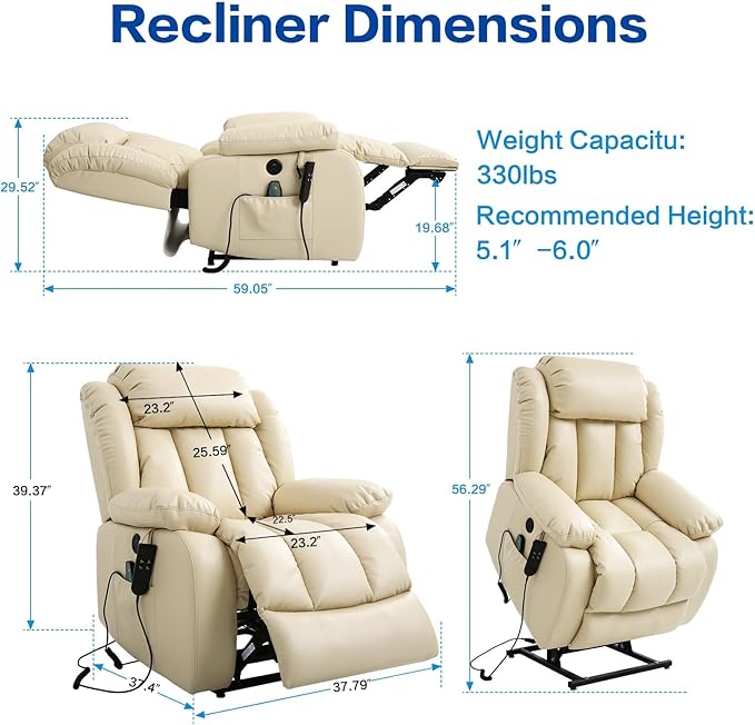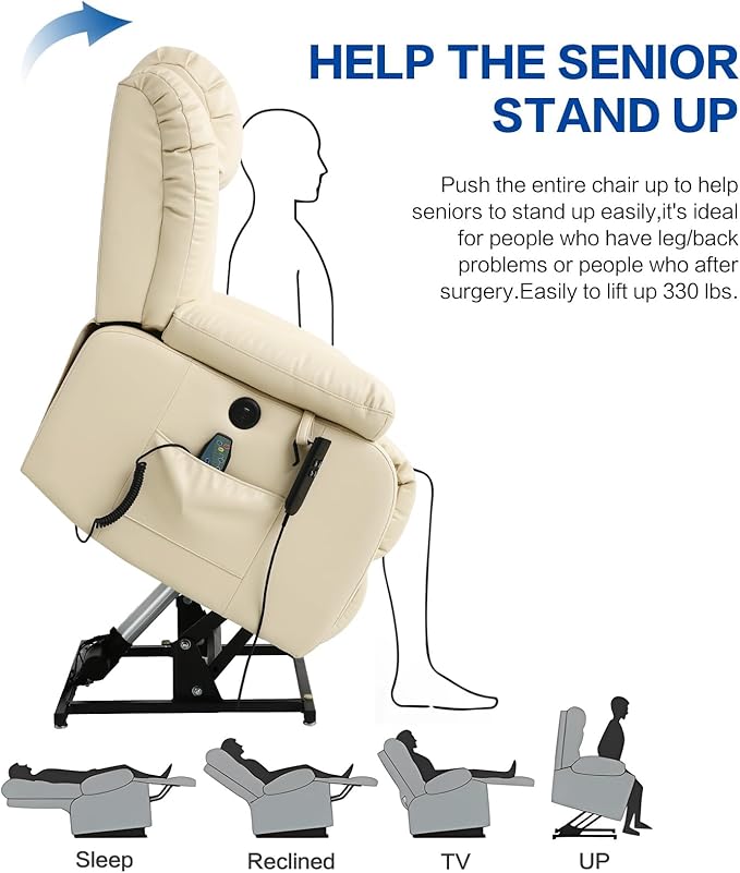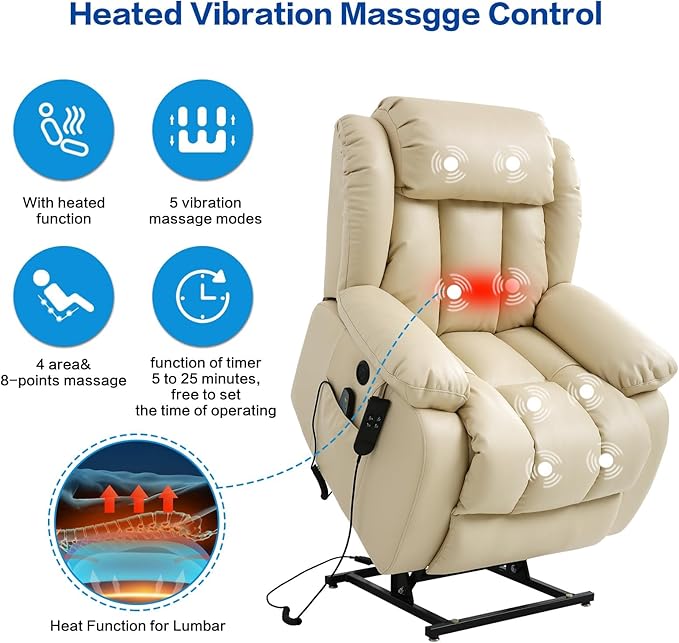 - 【Heating and Massage】The lift chair has eight massage points; three massage modes, the waist has a heating system that can provide waist care and heating for the elderly or other people in need; at the same time, the temperature-controlled heating system, 113℉~140℉, when it reaches 140℉, it will automatically cut off the power and continue to cool down to 113℉ before heating.