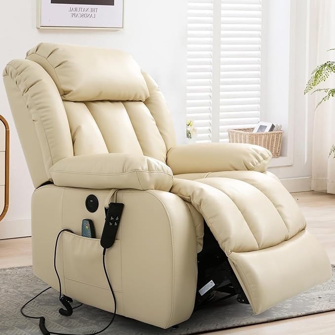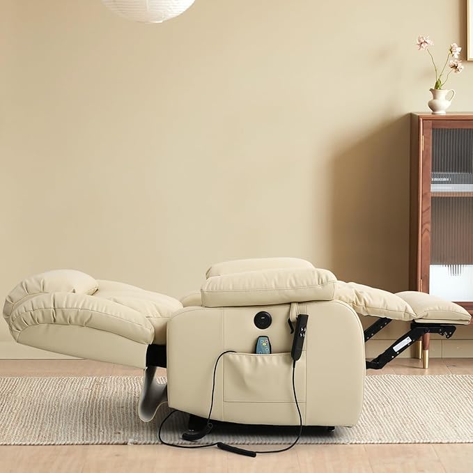 MAEVIS Power Recliner Chair, Lay Flat Sleeping Lift Chairs Recliner for Elderly with Heat and Massage,Comfy Real Breathable Leather Recliners with Dual OKIN Motor for Living Room (Beige)