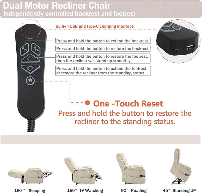 - 【Convenient Home Button, USB and Type-C Charger】We upgraded the remote control to make our chair more convenient to operate. The new remote control is equipped with USB port and Type-C charging interface and a Home button. Simply press and hold the Home button to reset the chair to a standing position within 15 seconds. You can release the button at any time to keep the chair in the position you need.