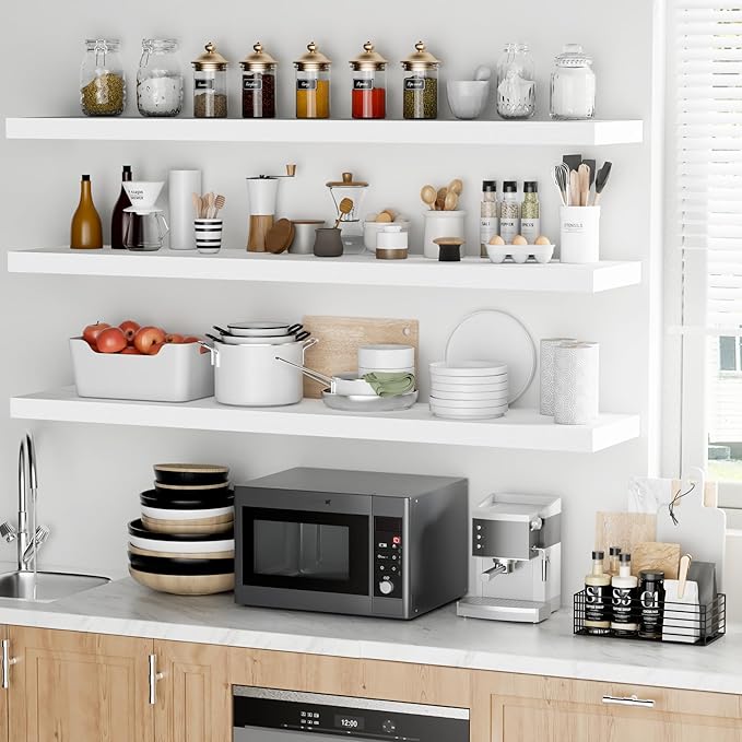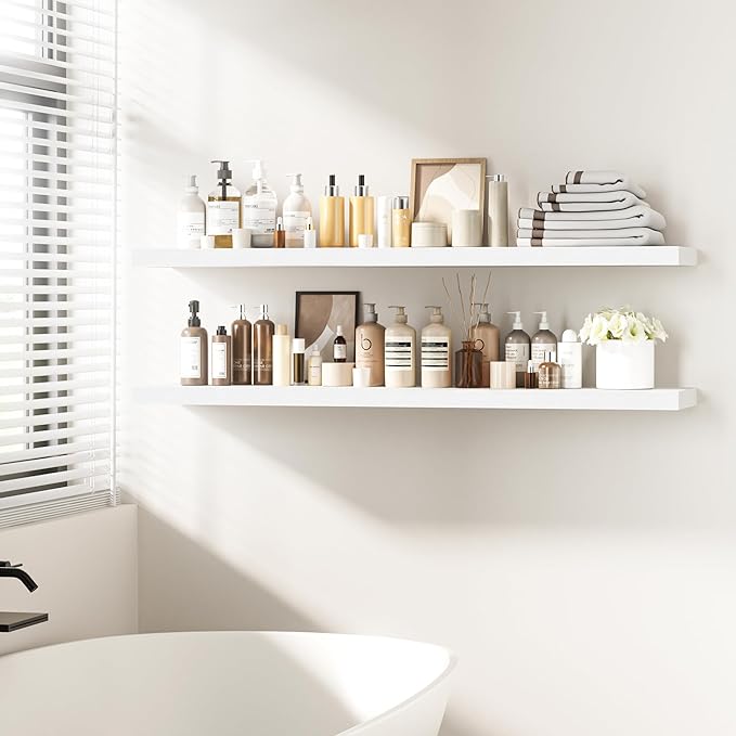 - Versatile & Multi-Scene Functionality: Our floating shelves are available in a variety of sizes and thicknesses, allowing you to choose the perfect fit for your space. Use them in the bathroom to store beauty products, hair care items. In the bedroom, they can hold books, cosmetics, and personal items. In the kitchen, theyβre perfect for spices, jars, or small utensils. Or display photo frames, trophies, or collections in the living room. These shelves efficiently use wall space to create a tidier, more spacious feel in any room.