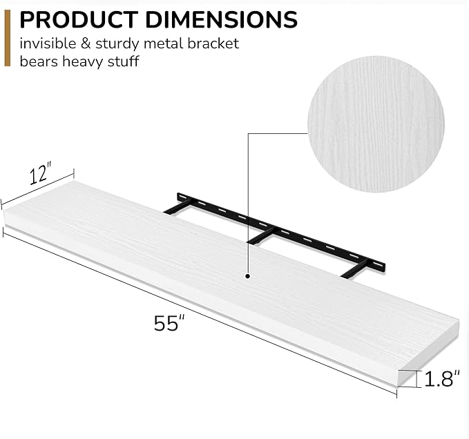 - Extra Deeper & Thicker - Each board measures 55"W x 12"D x 1.8"H. Extra deeper and thicker design in order to bring maximizes storage space and weight capacity, even hold up to 80 lb each. This floating shelf taking up zero square feet, reduces clutter and highlights dΓ©cor in compact spaces.