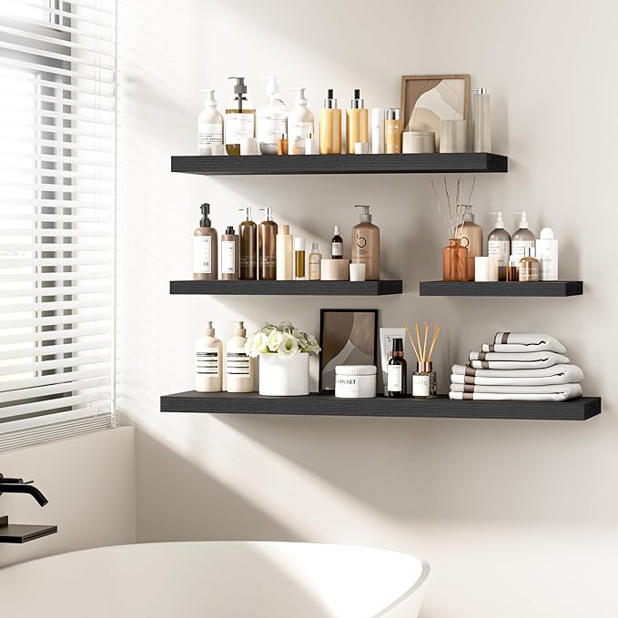 - Versatile & Multi-Scene Functionality: Our floating shelves are available in a variety of sizes and thicknesses, allowing you to choose the perfect fit for your space. Use them in the bathroom to store beauty products, hair care items. In the bedroom, they can hold books, cosmetics, and personal items. In the kitchen, theyβre perfect for spices, jars, or small utensils. Or display photo frames, trophies, or collections in the living room. These shelves efficiently use wall space to create a tidier, more spacious feel in any room.