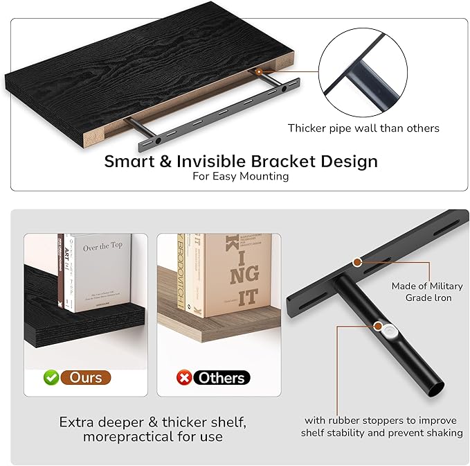 - Extra Deeper & Thicker - Each board measures 24"W x 12"D x 1.5"H. Extra deeper and thicker design in order to bring maximizes storage space and weight capacity, even hold up to 50 lb each. This floating shelf taking up zero square feet, reduces clutter and highlights dΓ©cor in compact spaces.
