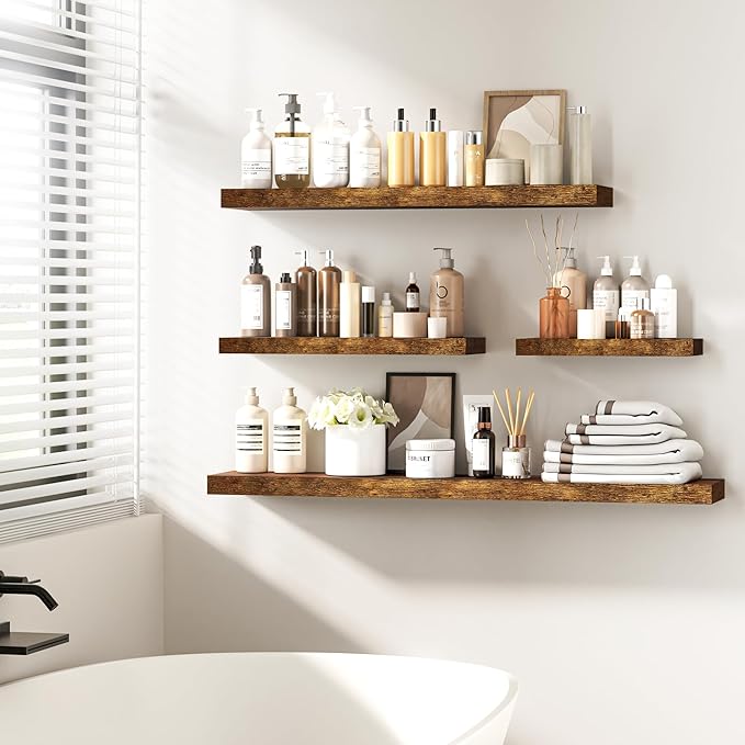 - Versatile & Multi-Scene Functionality: Our floating shelves are available in a variety of sizes and thicknesses, allowing you to choose the perfect fit for your space. Use them in the bathroom to store beauty products, hair care items. In the bedroom, they can hold books, cosmetics, and personal items. In the kitchen, theyβre perfect for spices, jars, or small utensils. Or display photo frames, trophies, or collections in the living room. These shelves efficiently use wall space to create a tidier, more spacious feel in any room.