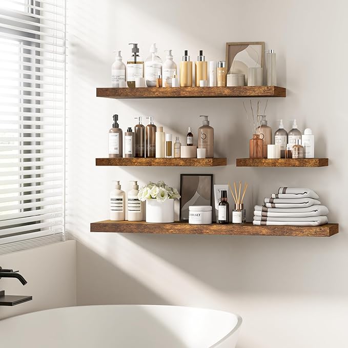 - Versatile & Multi-Scene Functionality: Our floating shelves are available in a variety of sizes and thicknesses, allowing you to choose the perfect fit for your space. Use them in the bathroom to store beauty products, hair care items. In the bedroom, they can hold books, cosmetics, and personal items. In the kitchen, theyβre perfect for spices, jars, or small utensils. Or display photo frames, trophies, or collections in the living room. These shelves efficiently use wall space to create a tidier, more spacious feel in any room.