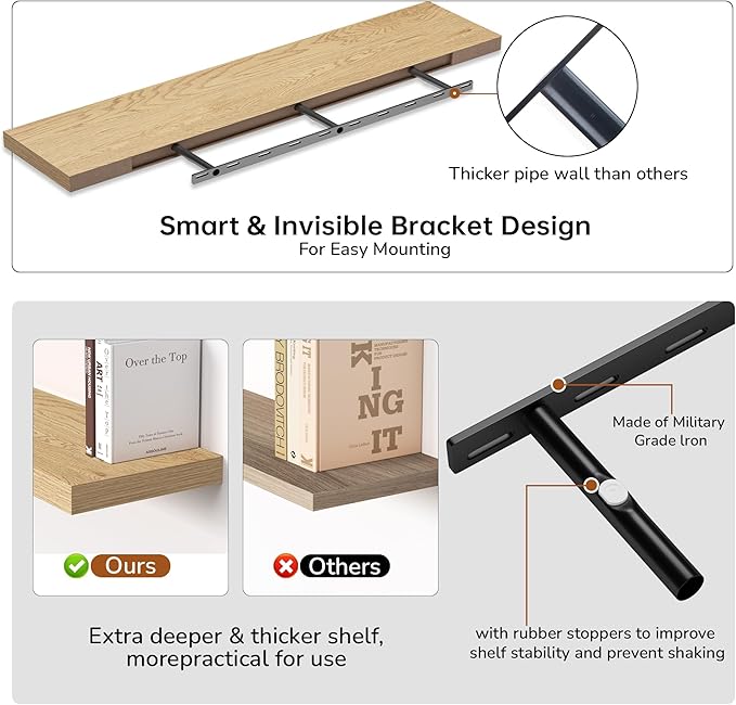 - Extra Deeper & Thicker - Each board measures 55"W x 9.3"D x 1.8"H. Extra deeper and thicker design in order to bring maximizes storage space and weight capacity, even hold up to 80 lb each. This floating shelf taking up zero square feet, reduces clutter and highlights dΓ©cor in compact spaces.