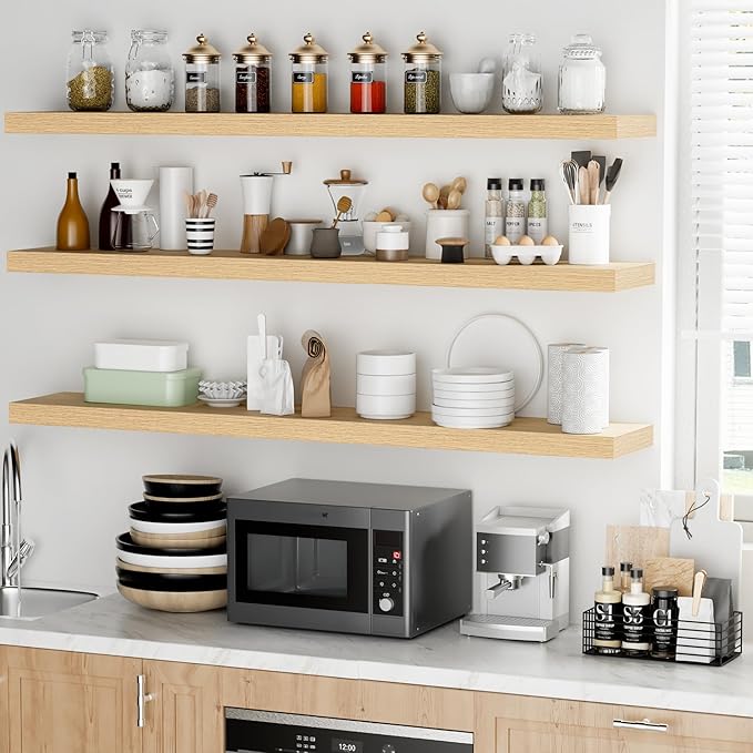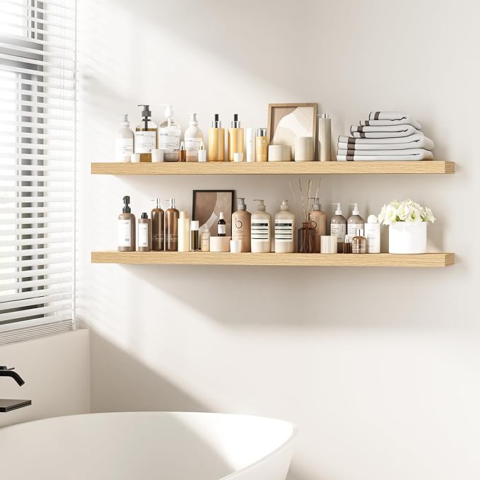 - Versatile & Multi-Scene Functionality: Our floating shelves are available in a variety of sizes and thicknesses, allowing you to choose the perfect fit for your space. Use them in the bathroom to store beauty products, hair care items. In the bedroom, they can hold books, cosmetics, and personal items. In the kitchen, theyβre perfect for spices, jars, or small utensils. Or display photo frames, trophies, or collections in the living room. These shelves efficiently use wall space to create a tidier, more spacious feel in any room.