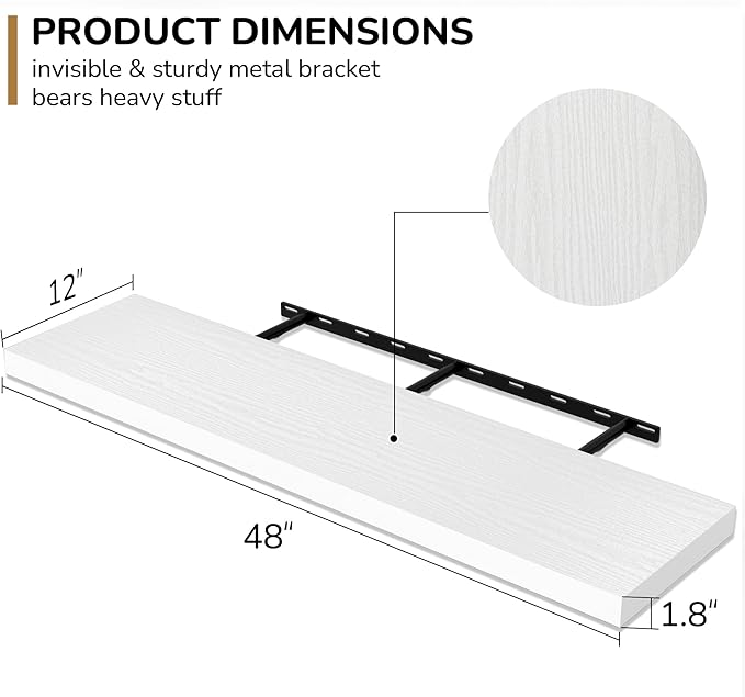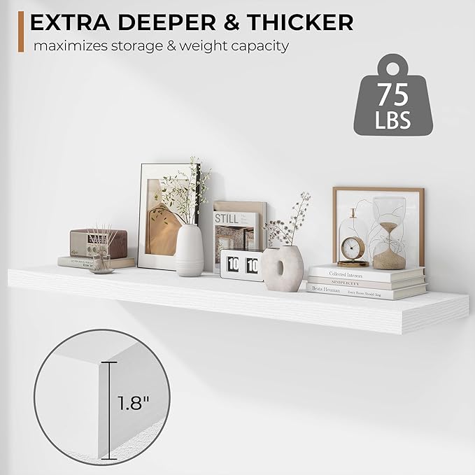 - Extra Deeper & Thicker - Each board measures 48"W x 12"D x 1.8"H. Extra deeper and thicker design in order to bring maximizes storage space and weight capacity, even hold up to 75 lb each. This floating shelf taking up zero square feet, reduces clutter and highlights dΓ©cor in compact spaces.