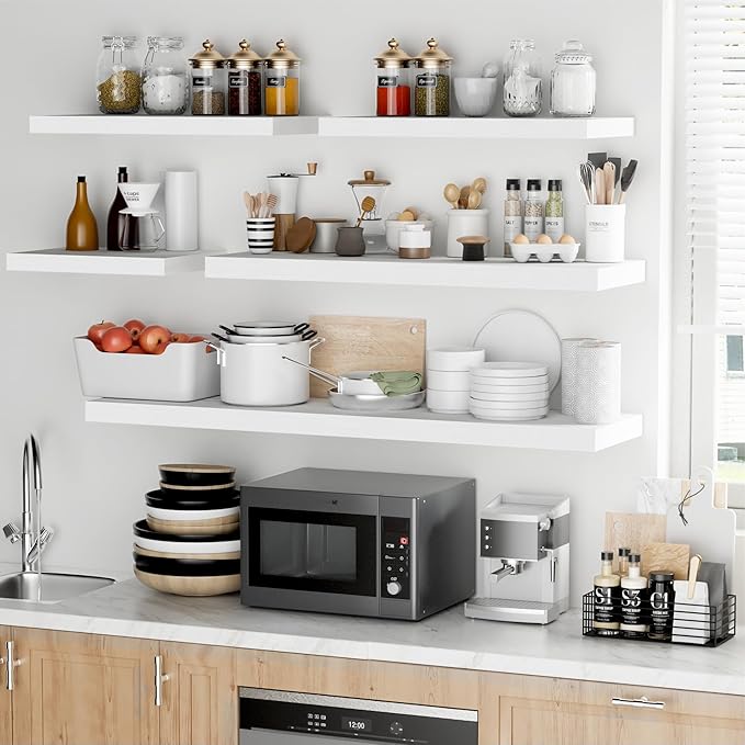 - Versatile & Multi-Scene Functionality: Our floating shelves are available in a variety of sizes and thicknesses, allowing you to choose the perfect fit for your space. Use them in the bathroom to store beauty products, hair care items. In the bedroom, they can hold books, cosmetics, and personal items. In the kitchen, theyβre perfect for spices, jars, or small utensils. Or display photo frames, trophies, or collections in the living room. These shelves efficiently use wall space to create a tidier, more spacious feel in any room.