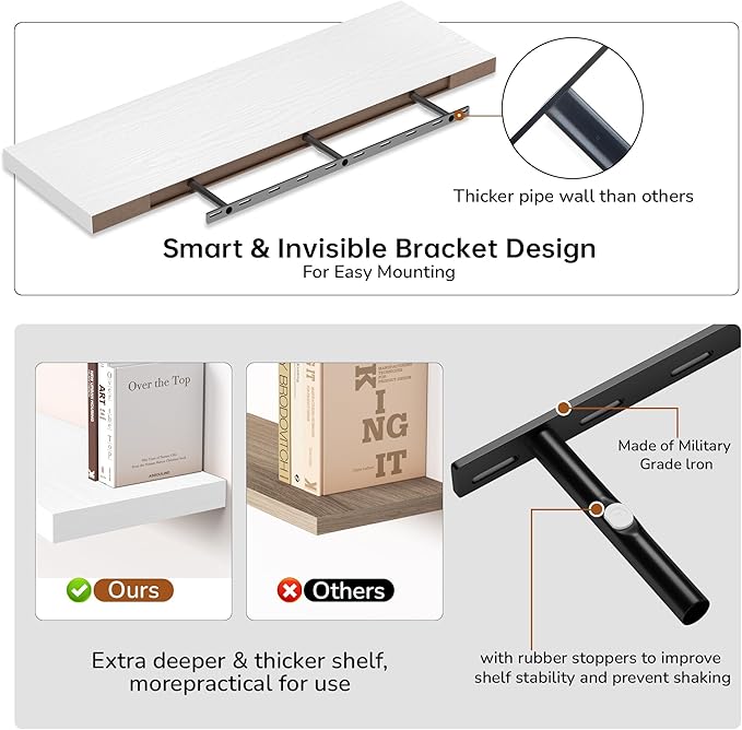 - Easy to Assemble & Install: Each shelf comes with everything you need for quick and easy assembly: durable steel invisible brackets, toggle bolts for drywall, and a straightforward instruction manual. With just one or two boards and a few screws, you can have the shelf up in no time. The included step-by-step instructions make the installation process hassle-free, and our customer support team is always available if you need assistance.