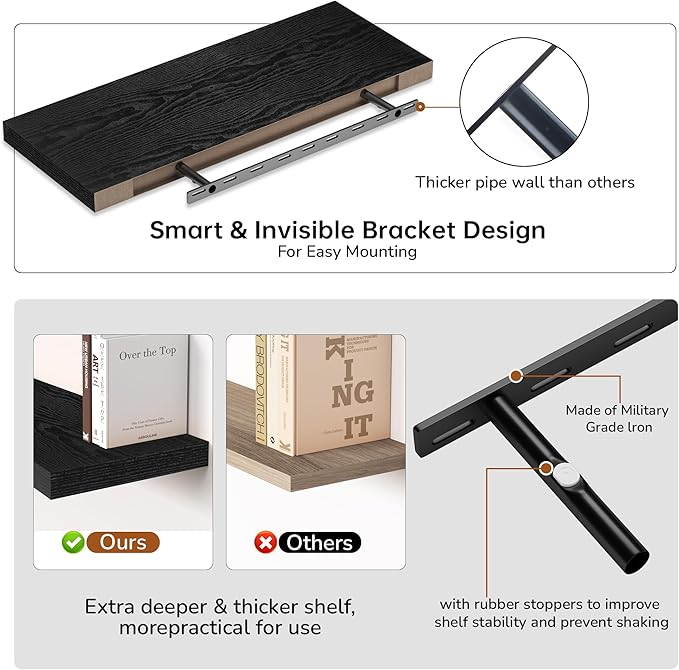 - Extra Deeper & Thicker - Each board measures 36"W x 12"D x 1.8"H. Extra deeper and thicker design in order to bring maximizes storage space and weight capacity, even hold up to 70 lb each. This floating shelf taking up zero square feet, reduces clutter and highlights dΓ©cor in compact spaces.