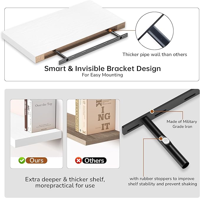 - Easy to Assemble & Install: Each shelf comes with everything you need for quick and easy assembly: durable steel invisible brackets, toggle bolts for drywall, and a straightforward instruction manual. With just one or two boards and a few screws, you can have the shelf up in no time. The included step-by-step instructions make the installation process hassle-free, and our customer support team is always available if you need assistance.