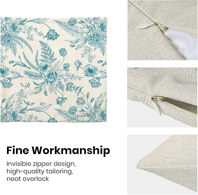 - 【Spring Pillow Covers】 Our Chinoiserie floral throw pillow covers 18x18 inch are made of excellent breathable polyester cotton fabric. The teal and White floral decorative pillow covers is sturdy, soft and skin-friendly. The plant outdoor pillow covers adopt exquisite edging technology and four sides of our floral pillow covers are sewn firmly, which is not easy to open the line.