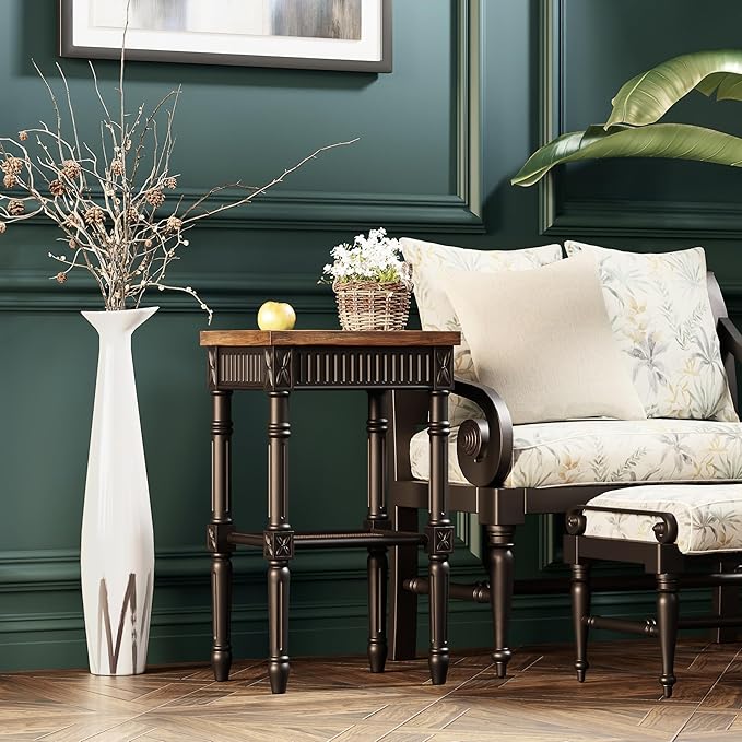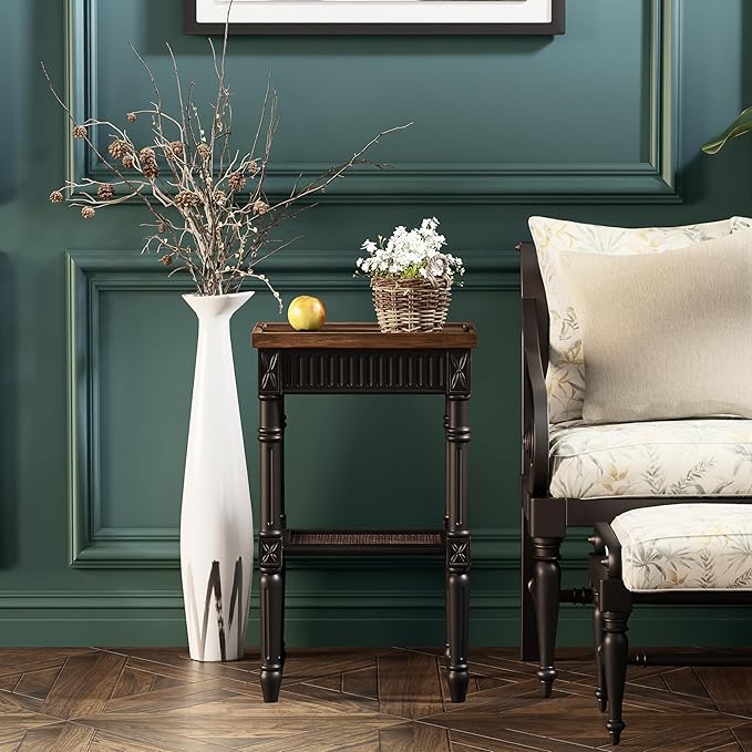 Rustic Farmhouse Cottagecore Accent End Table Set of 2, Distressed Accent Side Table with Espresso Tray Top and Woven Wicker Shelf, Boho, French Country Decor, Square, Weathered Brown & Black