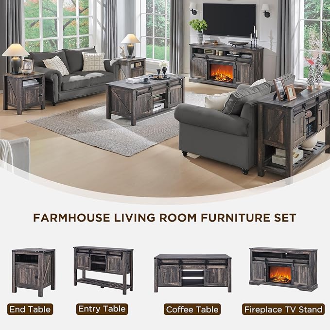 OKD Farmhouse Nightstand with Charging Station, 18" Rustic End Table with Adjustable Storage Shelf, Wood Rustic Wood Sofa Side Table for Bedroom